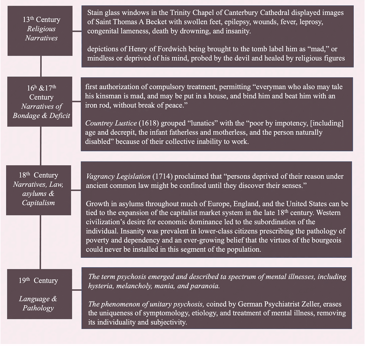 Narratives that marginalized people suffering from mental illness reach as far back as the early thirteenth century. Stain glass windows in the Trinity Chapel of Canerbery Cathedral, displayed images of Saint Thomas A Becket with swollen feet, epilepsy, wounds, fever, leprosy, congenital lameness, death by drowning, and insanity. Similarly, depictions of Henry of Fordwitch being brought to the tomb label him as “mad,” or mindless, or deprived of his mind, probed by the devil and healed by religious figures—signifying the role of religion in the formation of beliefs about the mentally ill3.